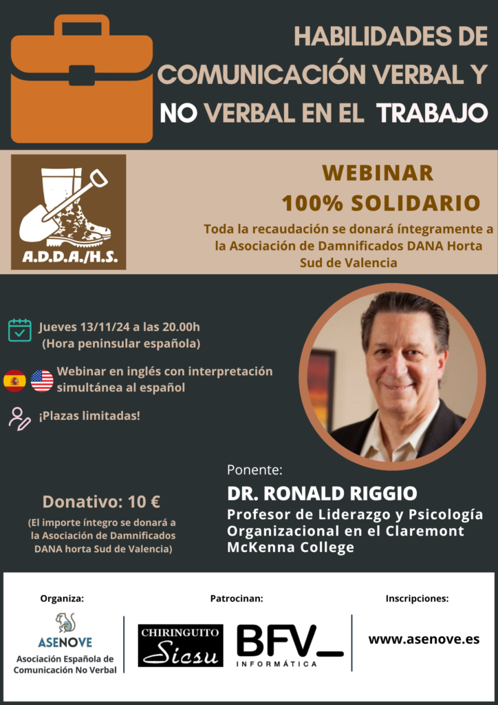 Te invitamos a participar en un webinar único a cargo del Dr. Ronald Riggio, una de las máximas autoridades internacionales en el estudio de la comunicación no verbal y las habilidades sociales aplicadas al mundo del trabajo. En este webinar, exploraremos cómo los avances en la investigación sobre comunicación no verbal y competencias sociales están transformando la dinámica de los entornos profesionales. Analizaremos su influencia directa en aspectos clave como el funcionamiento de los equipos, los procesos de selección de personal y el ejercicio del liderazgo.